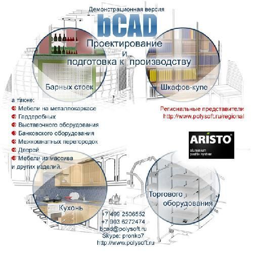 http://www.bcad.ru/news. Дополнительную информацию, а также ответы на все вопросы по работе в программном пакете «bCAD Мебель Про» и использованию библиотеки комплектующих «АРИСТО», Вы можете получить в службе технической поддержки компании «ПолиСОФТ Консалтинг» по ссылке: