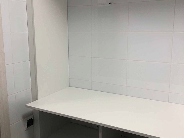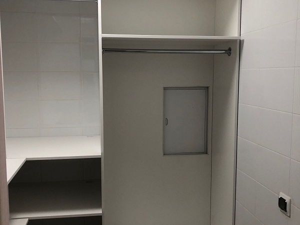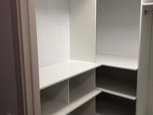 Для корпуса шкафа использовали ЛДСП Lamarty (Ламарти) толщиной 16 мм в белом цвете. За счет светлого оттенка мебель не выглядит громоздко и гармонирует с отделкой помещения.