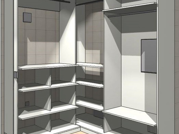 С учетом геометрии помещения — выступ стены — нарисовали корпус встроенного углового шкафа. В нем предусмотрели штанги, полки, выпил под сантехнический люк для доступа к коммуникационным системам. Пространство не стали перегружать ненужными дверцами. Получилась недорогая система хранения — бюджетный вариант гардеробной.