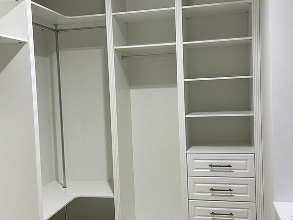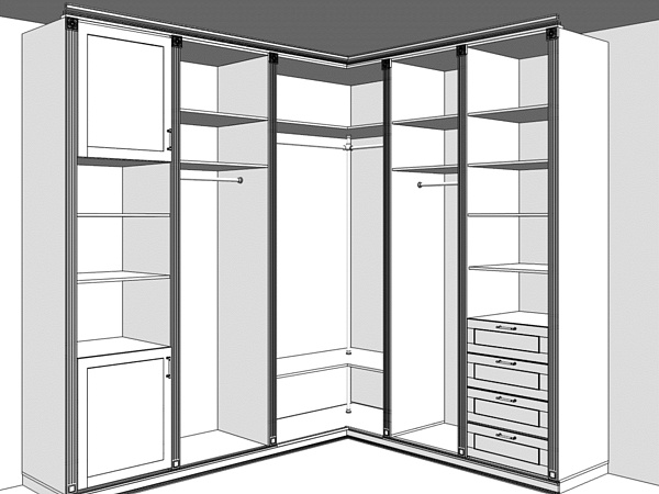 Мы спроектировали для него угловой гардероб с открытыми секциями, выдвижными ящиками и распашными фасадами.
