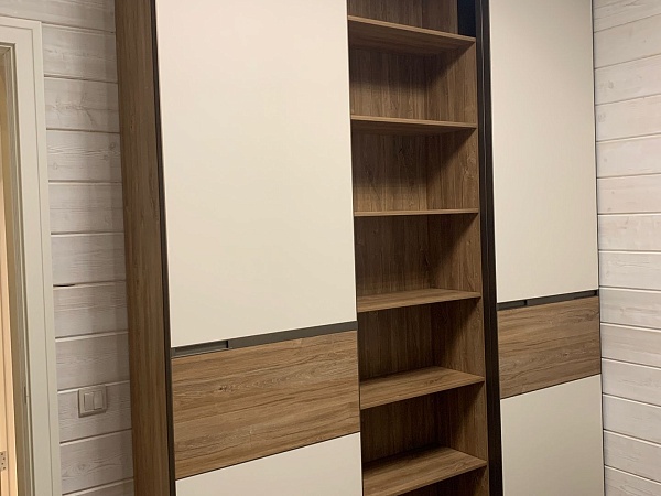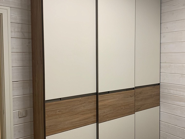 Для всех трех шкафов выбран материал фасада – ДСП EGGER Дуб Канзас коричневый H1113/ST10, и МДФ в эмали с покраской по RAL 9001. Цвет профиля – Шампань матовая.