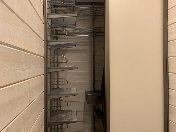 Для ниши в прихожей сделали угловую гардеробную с функциональным наполнением: штанга для одежды, корзины выдвижные с доводчиком, корзина боковая навесная, полки с боковыми упорами, крючки.