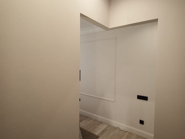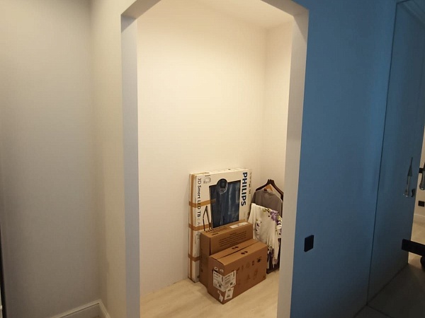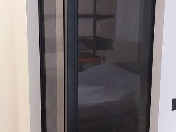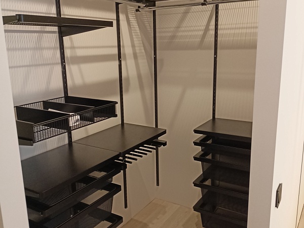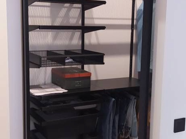 Реализовали проект Гардеробной комнаты ARISTO и отделили вход в гардеробную комнату подвесными стеклянными дверями.