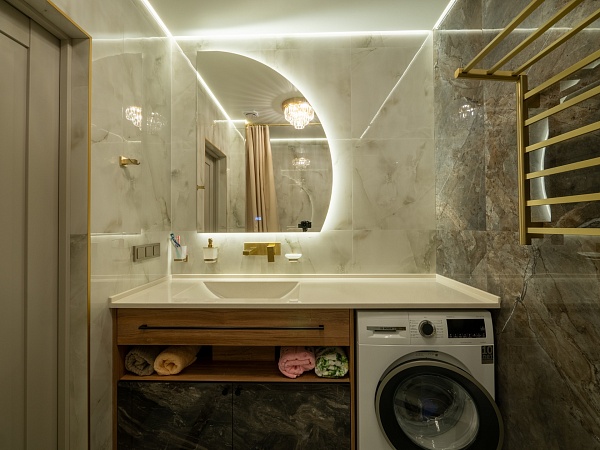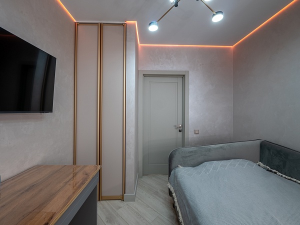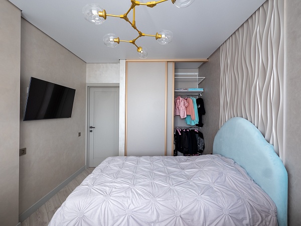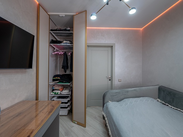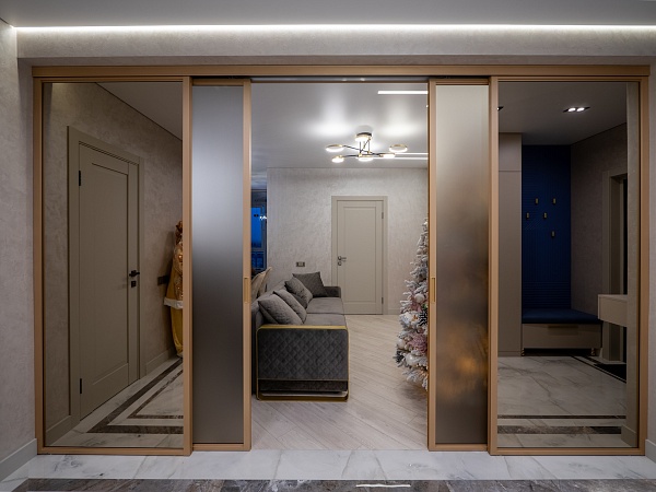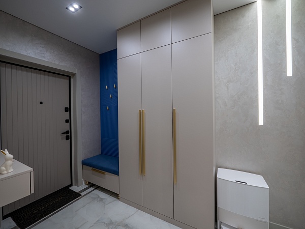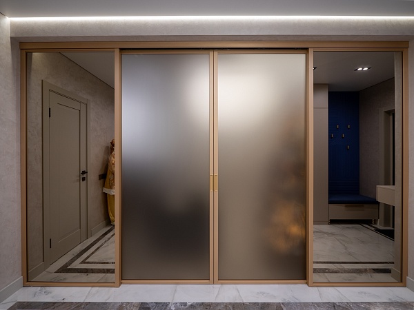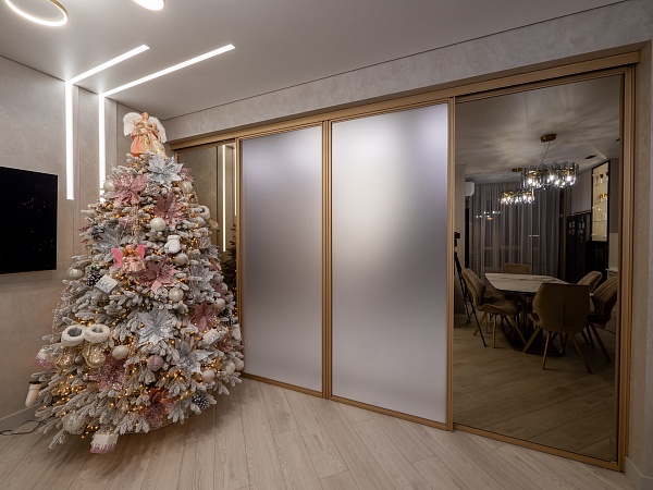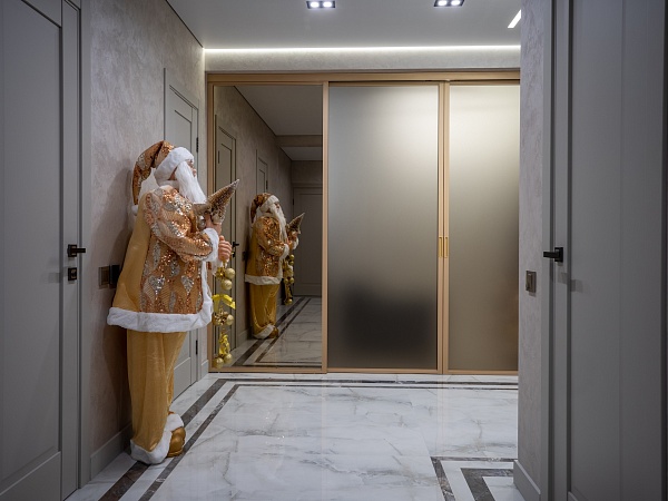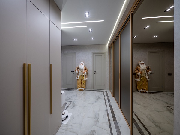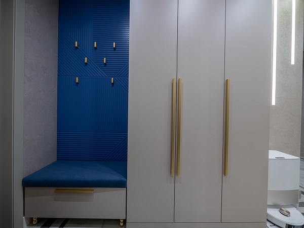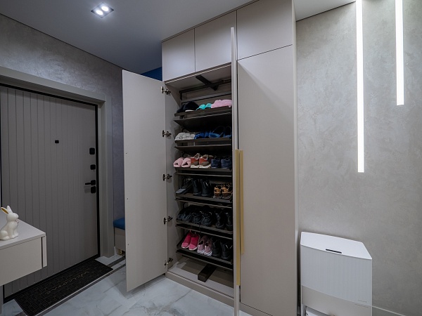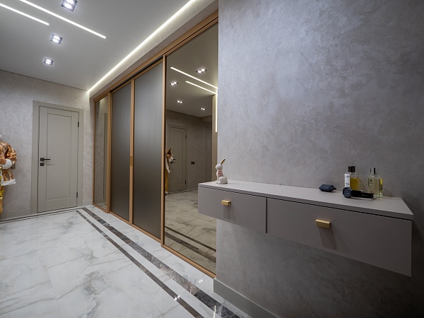 Перед специалистами ARISTO стояла задача по созданию мебели для нескольких комнат: прихожей, гардеробных, ванной, домашней прачечной, родительской спальни и двух детских комнат. Также было необходимо создать межкомнатные перегородки для зонирования гостиной – при помощи перегородок отделить прихожую и лоджию.