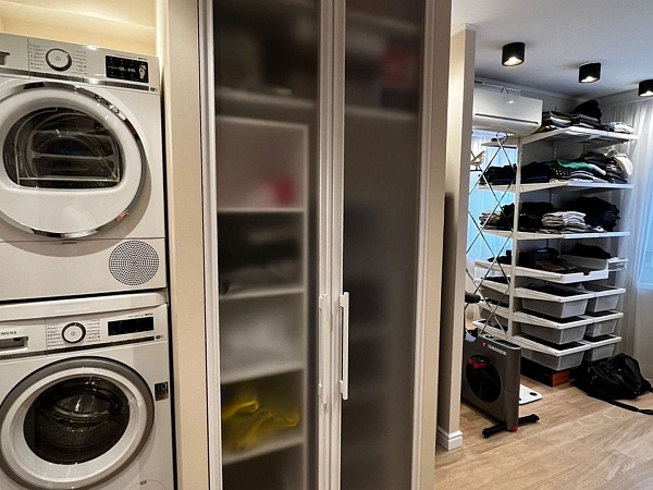 К нам обратилась дизайнер Юлия Шестакова с просьбой организовать для клиента гардеробную для вещей и отдельный встроенный шкафчик с выдвигающимся стеллажом для хранения бытовой химии. Особым пожеланием дизайнера было сделать все не только красиво и в едином стиле, но и практично.