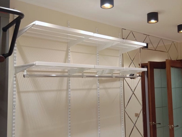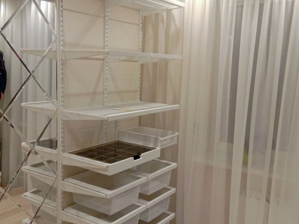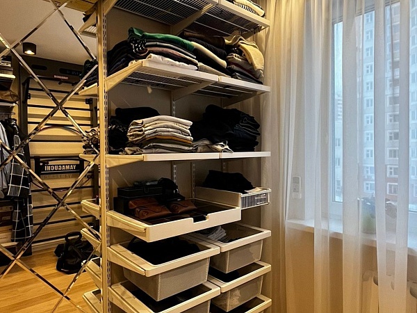 Для организации хранения выбрали Гардеробную систему ARISTO в белом цвете с элементами декора «Белое дерево». Сетчатые полки обеспечивают хорошую вентиляцию и обзор, а выдвижные корзины в рамках с доводчиками и полочка для аксессуаров – идеально дополняют проект и позволяют проще сохранить порядок.