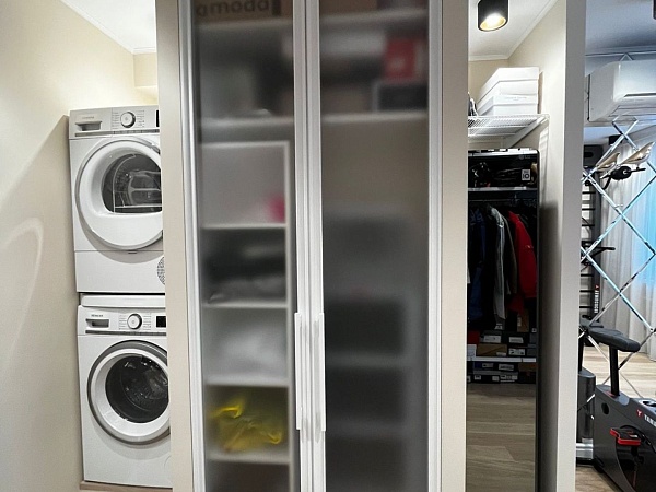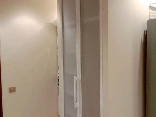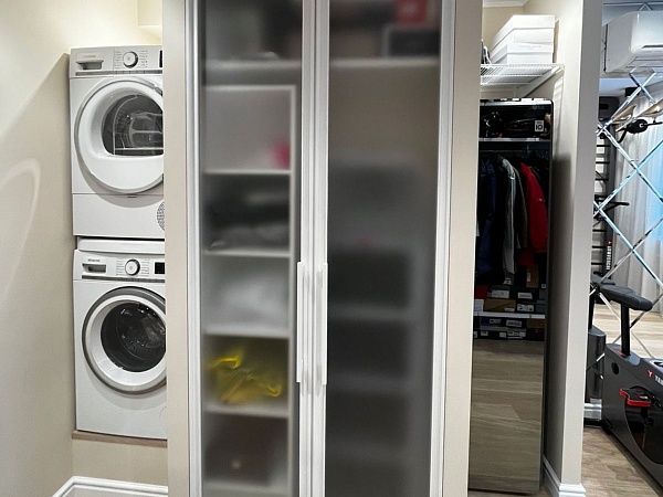 Для распашных дверей встроенного хозяйственного шкафчика использовали профиль ARISTO FUSION (Фьюжн) Белый матовый с открытием фасадов за ручки-рейлинг. Вставка в двери – Стекло Optiwhite (осветленное) матовое. Особенностью проекта стал небольшой вертикальный ЛДСП стеллаж на колесиках, который при необходимости, можно выдвинуть и освободить доступ к электрощитку внутри шкафа.