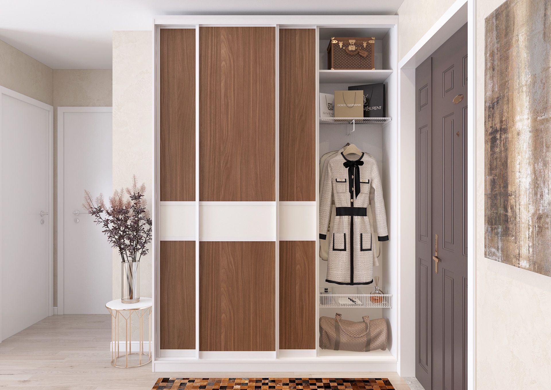 Мы производим гардеробные, шкафы-купе, межкомнатные перегородки и двери на заказ. Дизайн-проект гардеробной, расчет и заказ, включая доставку и монтаж можно оформить в наших салонах.