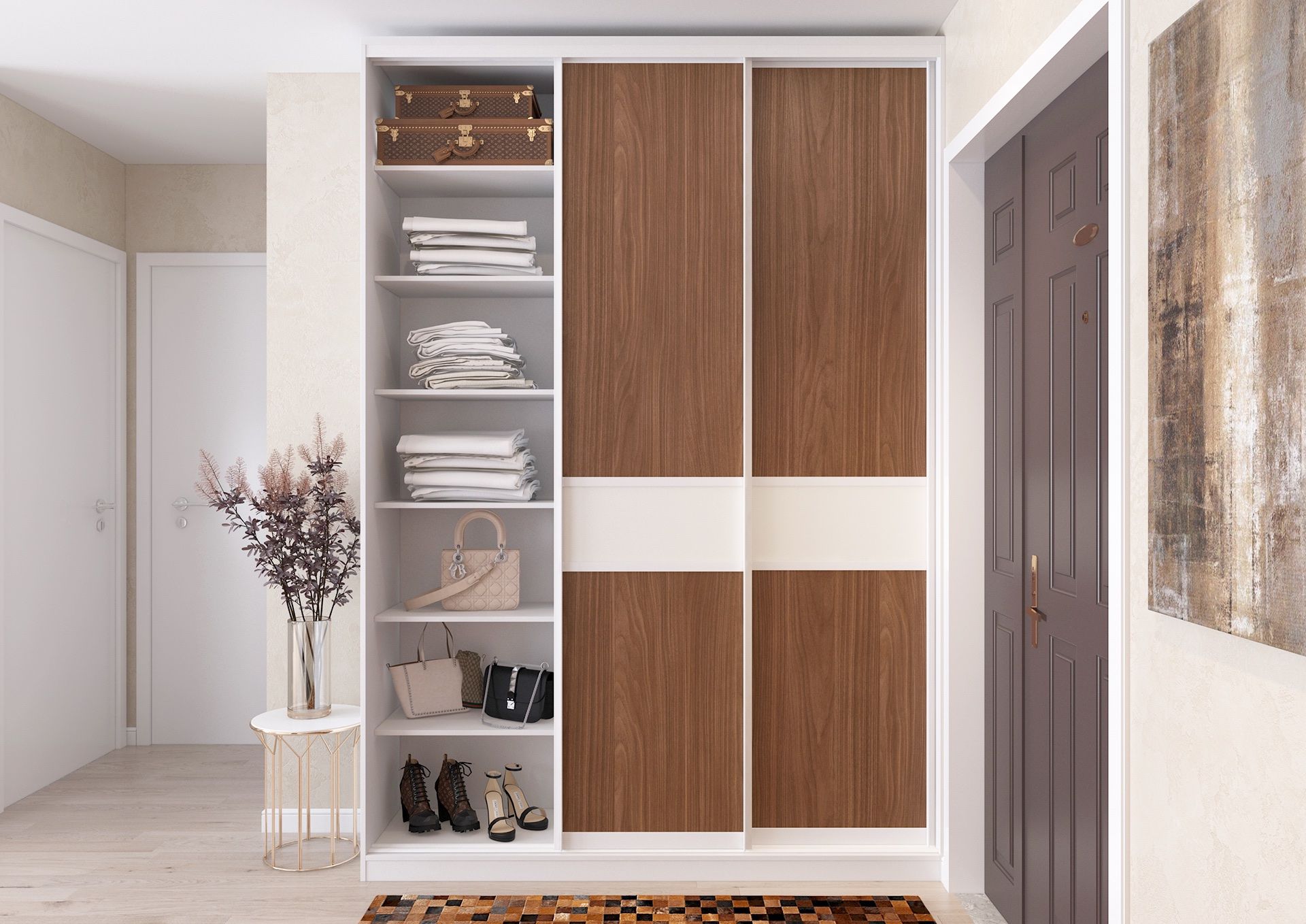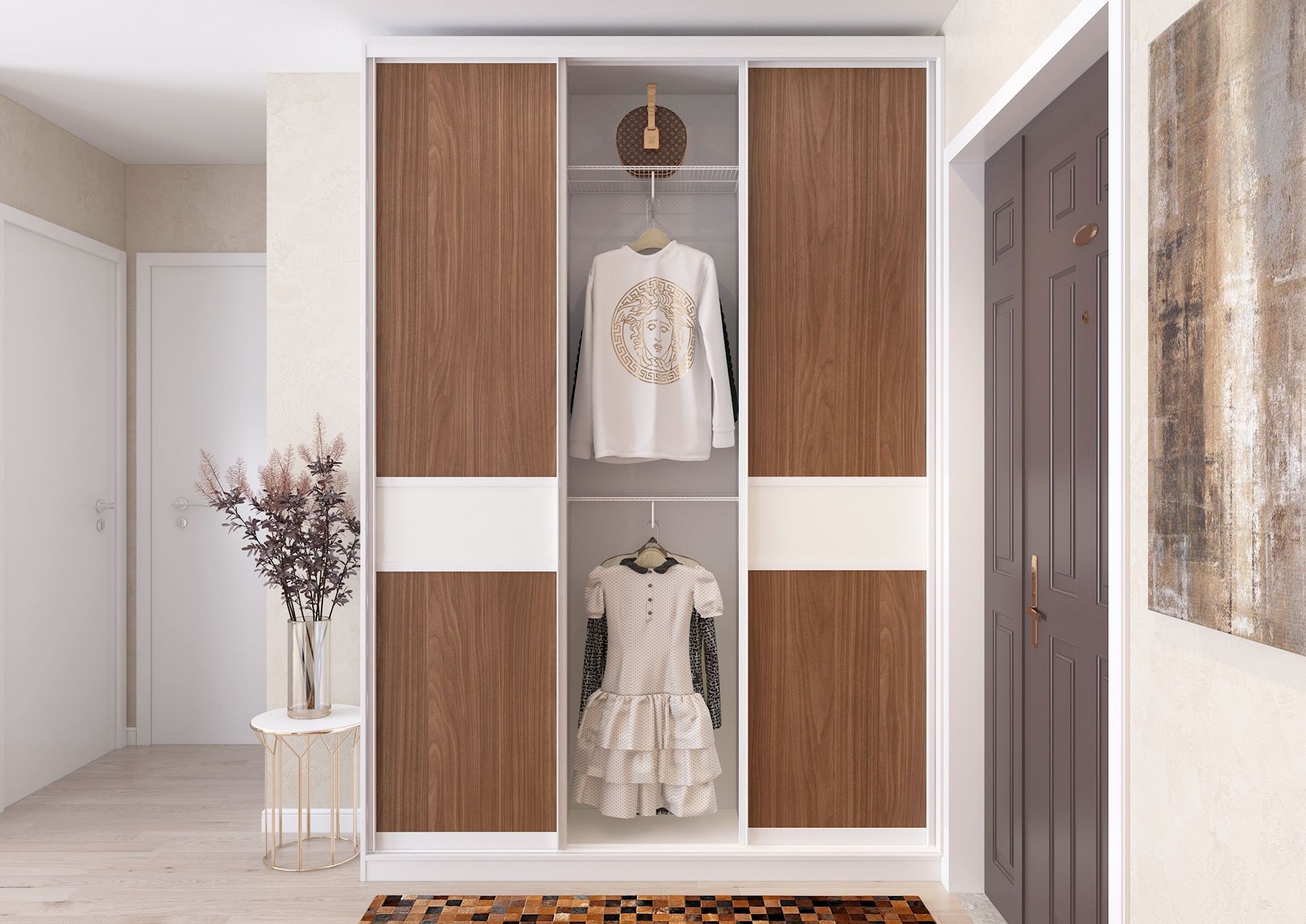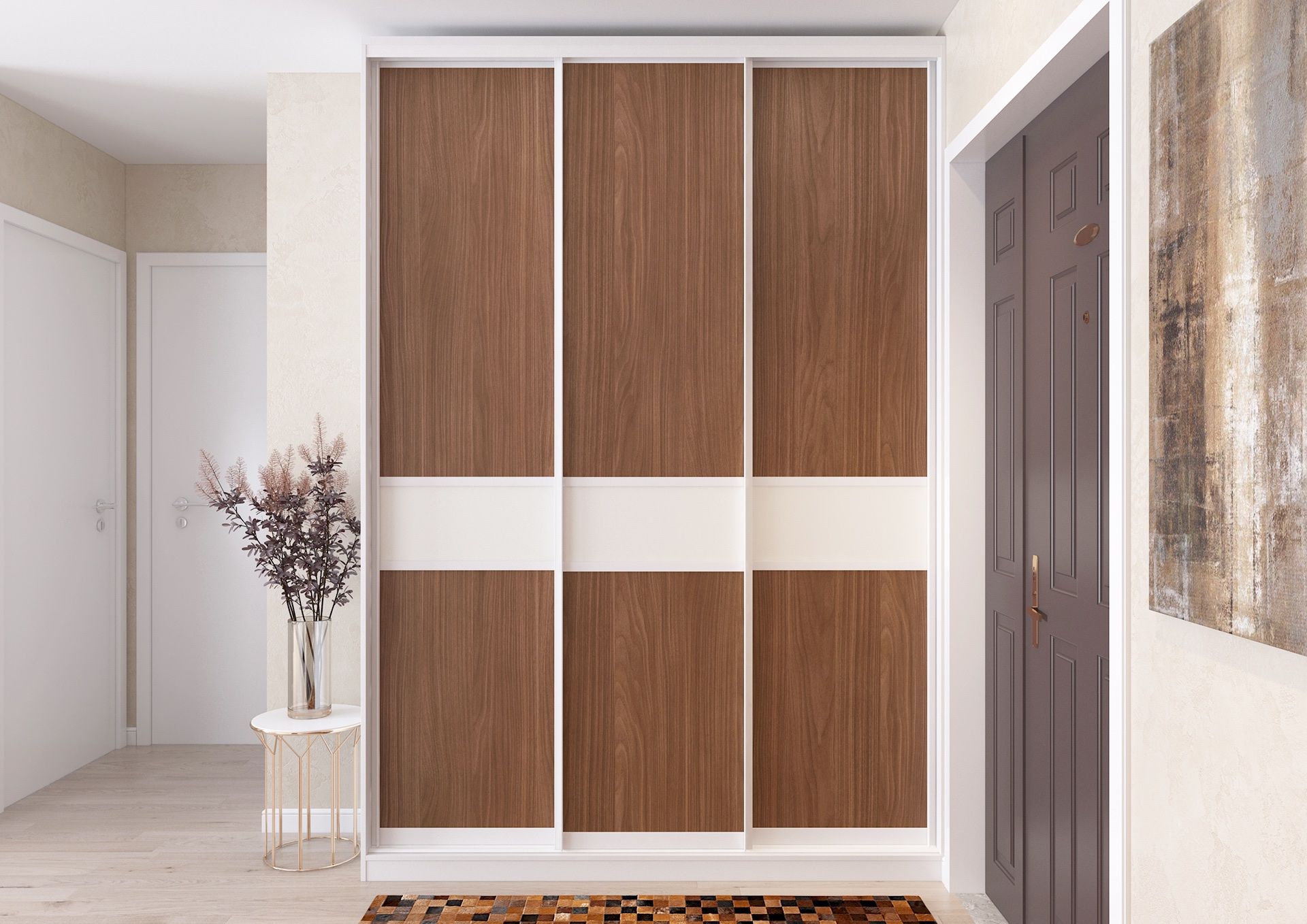 Раздвижные двери в данном проекте корпусного шкафа-купе выполнены из ЛДСП от Egger с декором «Орех Линкольн». Этот выразительный золотистый оттенок с естественной фактурой древесины дополнен лаконичной белой вставкой из ЛДСП цвета «Белый Премиум». Ручка-профиль I также выполнена в цвете «Белый матовый».