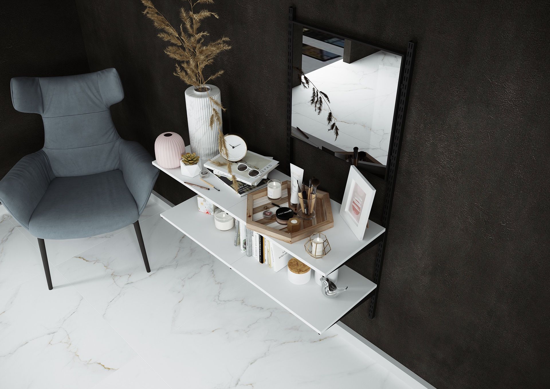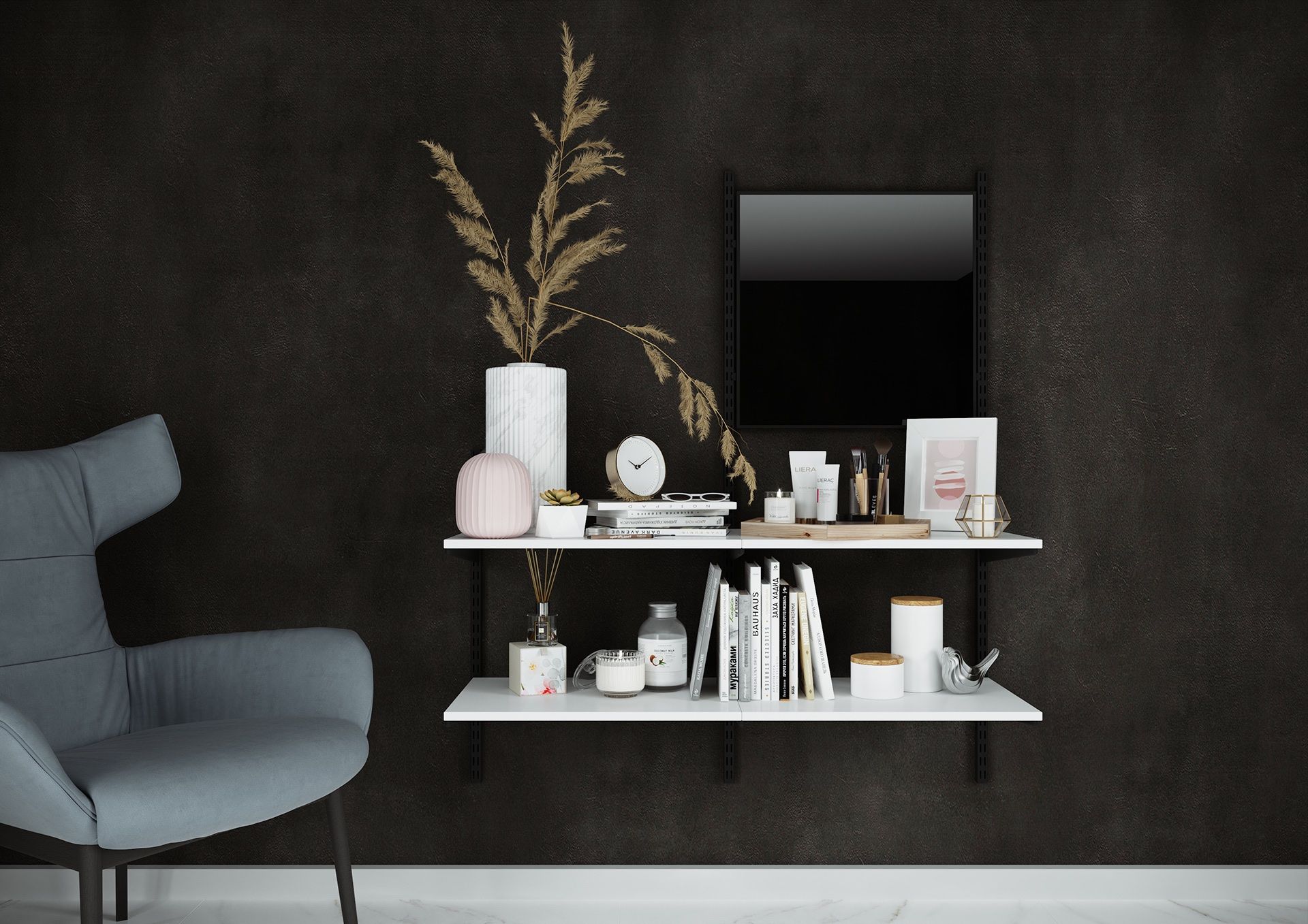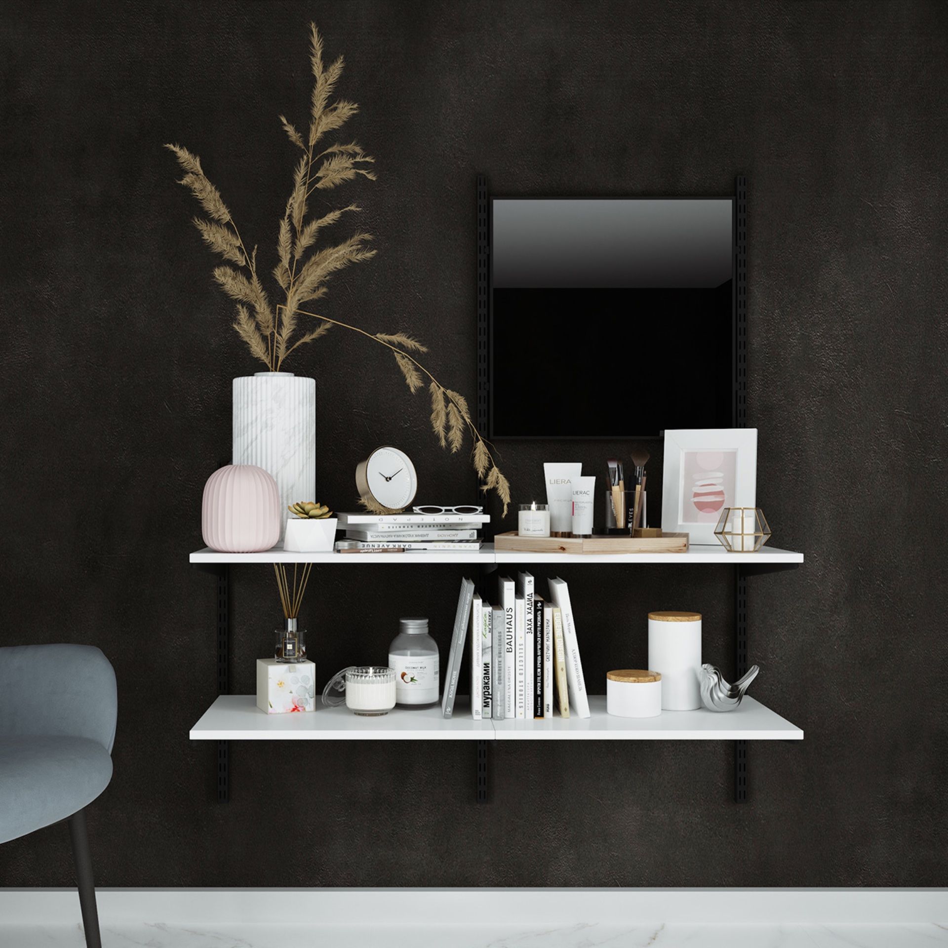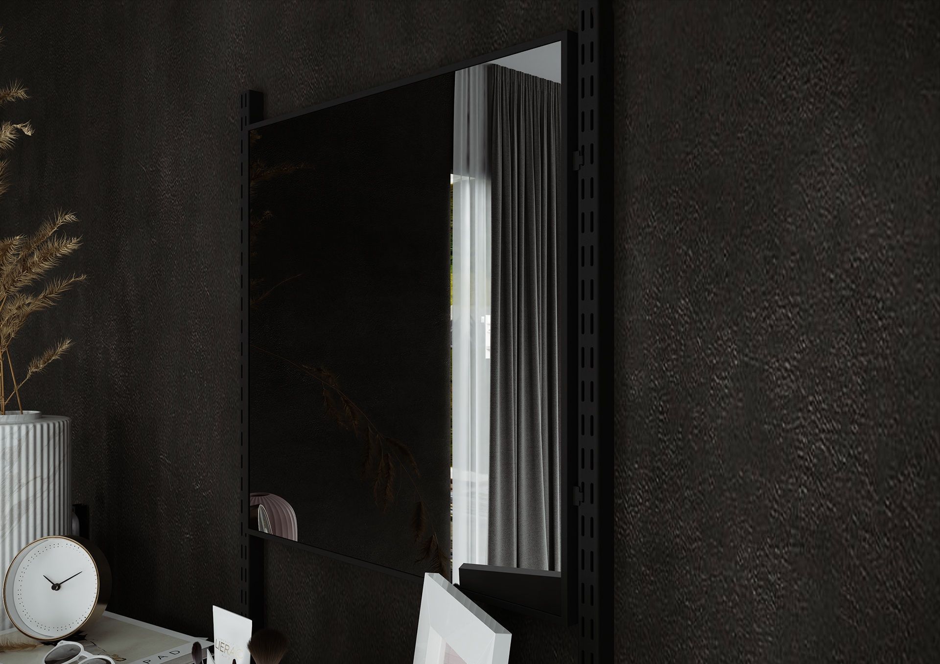 Белая полка и зеркало в изящной узкой алюминиевой раме черного цвета – оригинальная композиция. Двумя полками можно вполне заменить тумбочку или туалетный столик. Полки навесные из ЛДСП Egger ЛДСП 16 мм Белый Премиум и зеркало в рамке фиксируются на черных кронштейнах, которые крепятся к металлическим направляющим на удобной для Вас высоте.
