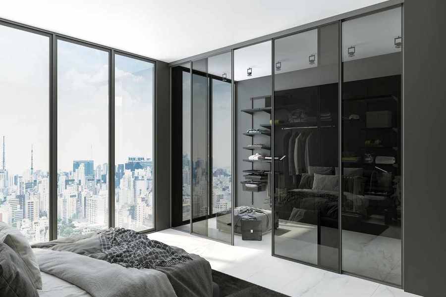 При естественном освещении двери зеркальные. Они расширяют пространство и скрывают возможный беспорядок в вещах. Включите свет в гардеробной — и двери станут кристально прозрачными. Перед вами откроется весь ваш гардероб — красивая открытая конструкция станет частью интерьера. Выключите свет — и снова зеркала.